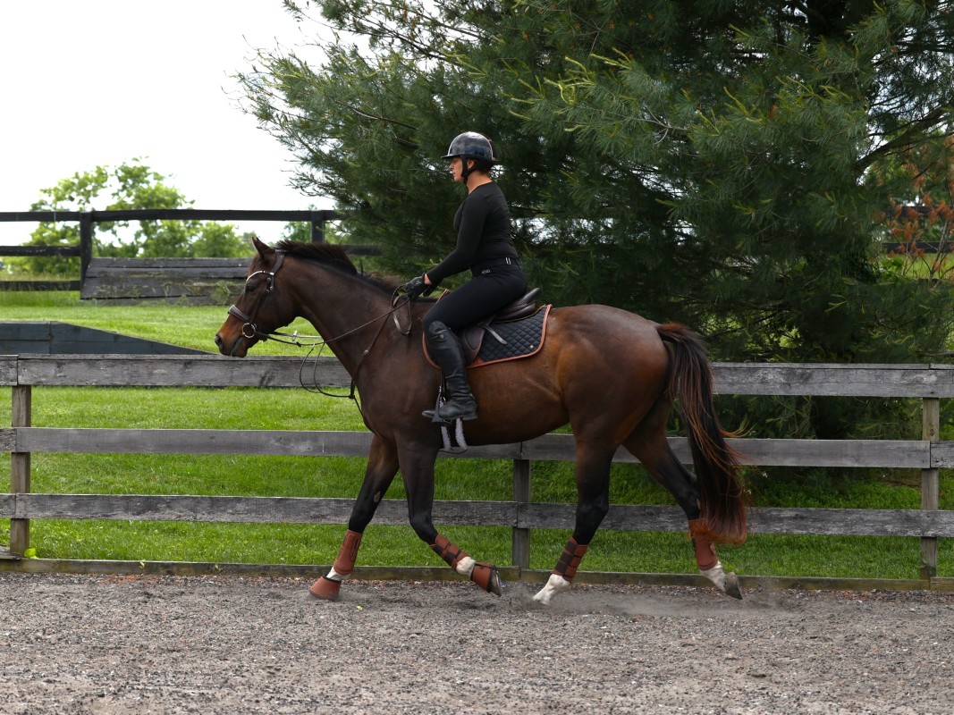 Regardless of whether you're riding on the flat or over fences, the aim is to determine how strongly you need to use your aids to achieve the desired reaction. After practicing several times at this level of intensity, you should try to progressively request less forcefully (for example, using just the leg cues rather than a whip, and eventually not needing verbal prompts at all).